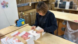 検品後は、バッグの数量を数えてダンボールへ梱包します。